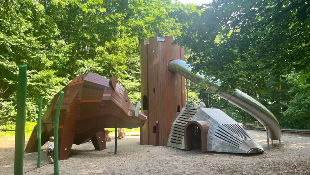 Legepladsen er fyldt med sjove detaljer og fantasifulde elementer, der indbyder til rolleleg og eventyr. Her er blandt andet en lille købmandsbutik med indbygget køkken, et lavt vandbassin der egner sig perfekt til dinosaurleg, en rutsjebane – og ikke mindst en stor træbus, hvor børnene kan sidde og “køre” afsted på tur.
